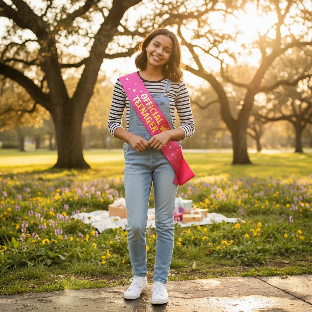 Celebrate her official entry into the teen years with our stunning ‘Official Teenager’ birthday sash! This beautiful pink and gold satin sash is the perfect accessory to make her 13th birthday unforgettable. It’s designed to be the star of the party, perfect for photos and making memories.